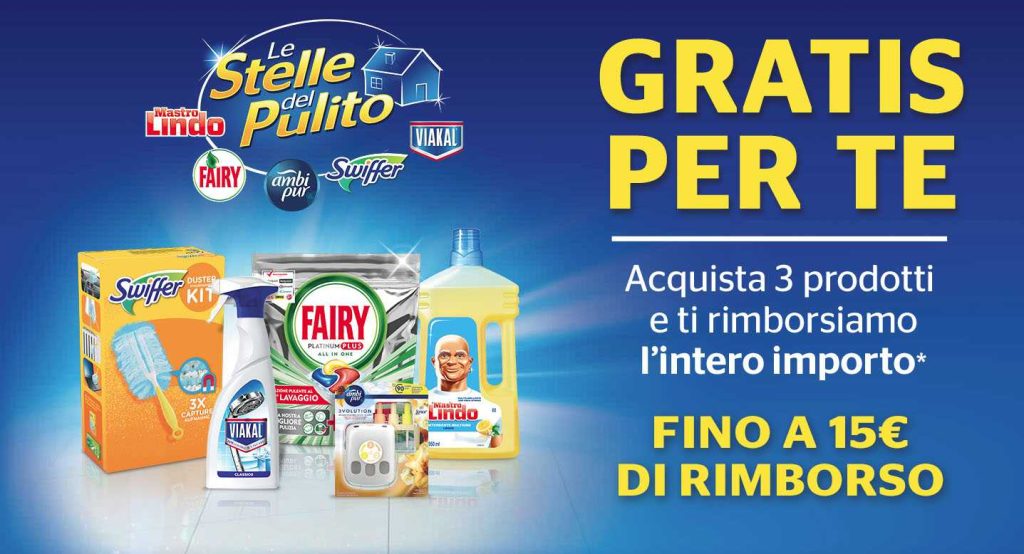Acquista tre prodotti a scelta delle Stelle del Pulito cioè dei marchi Mastro Lindo, Fairy, Ambi Pur, Swiffer, Viakal e Febreeze e ricevi il rimborso fino a 15 euro grazie all’iniziativa “Stelle del pulito gratis per te 2020“.